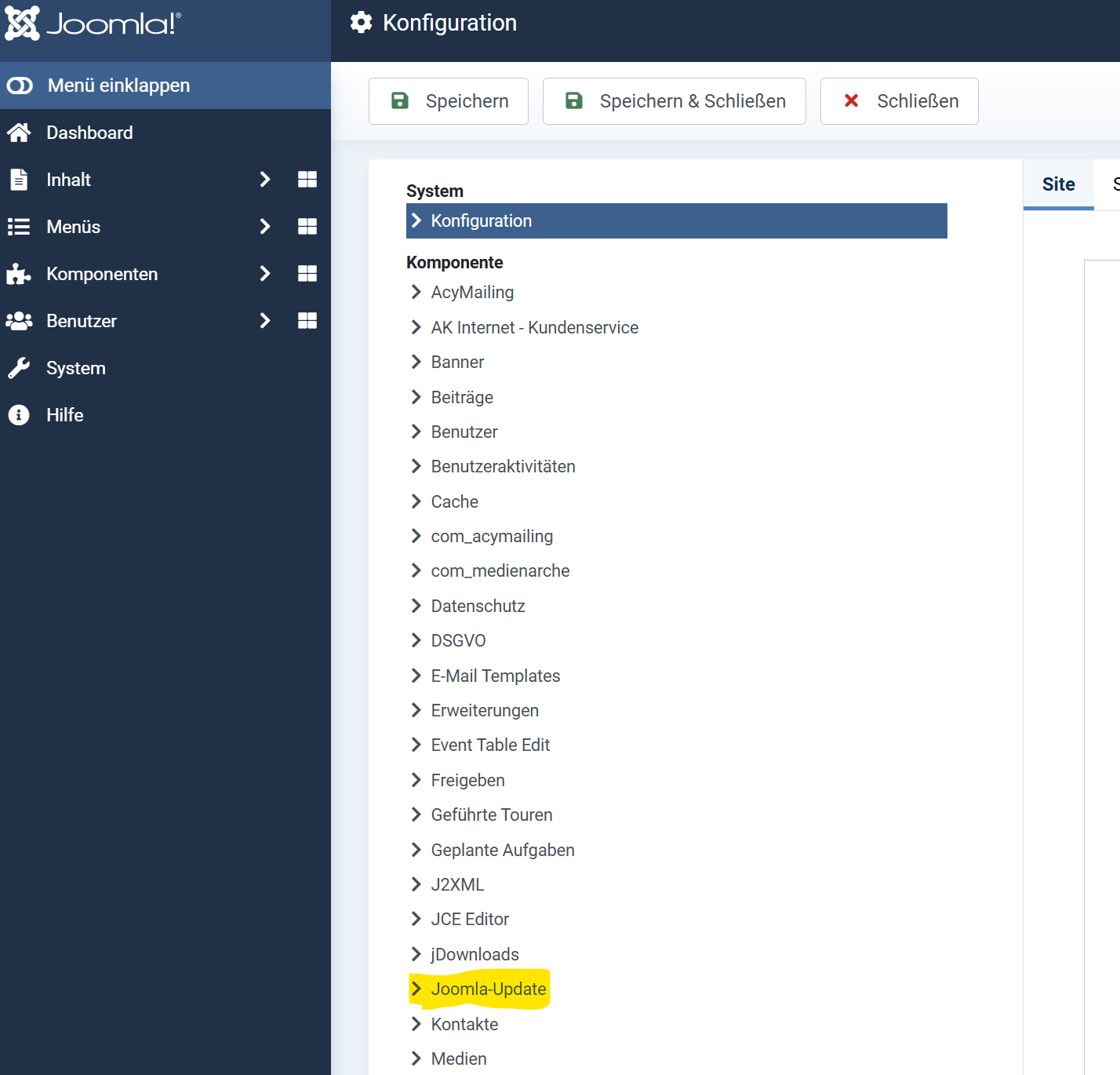 Im Backend geht ihr auf den Menüpunkt System und dann auf Konfiguration. Bei den dann angezeigten Einträgen wählt ihr Joomla-Update aus.