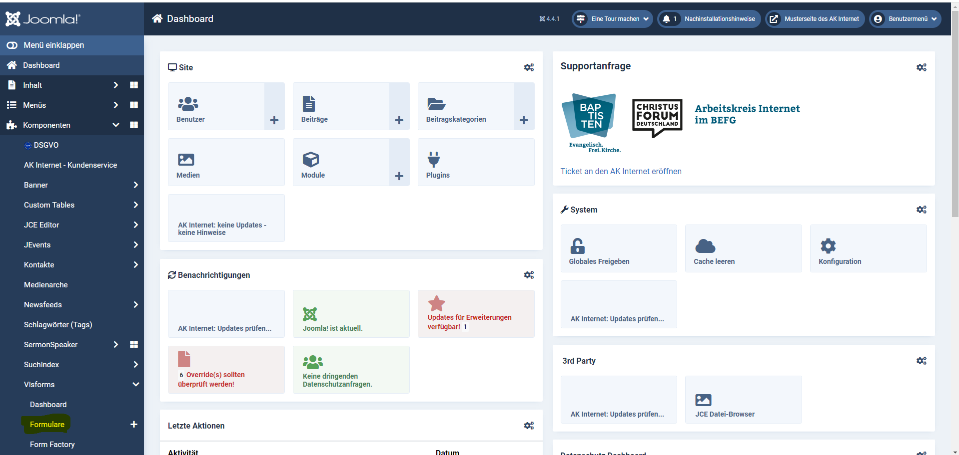 Für das Kontaktformular wird die Komponente Visforms genutzt. Mit dieser Komponente können beliebig viele Formulare erstellt werden. Jedes Formular kann an eine andere Emaildresse versandt werden.